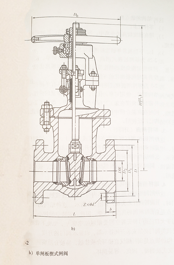 图2-2b为单闸板楔式闸阀,这种阀门结构简单,使用可靠,但对密封面角度的精度要求较高,加工和维修比较困难,温度升高时闸板楔住的可能性较大。