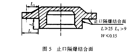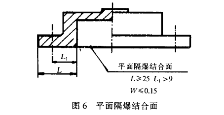 图6为处发送器后端盖上的平面隔爆结合面。在设计过程中应保证隔爆结合面有效长度L和接合面间隙W,L表示螺孔中心线到防爆面的距离。