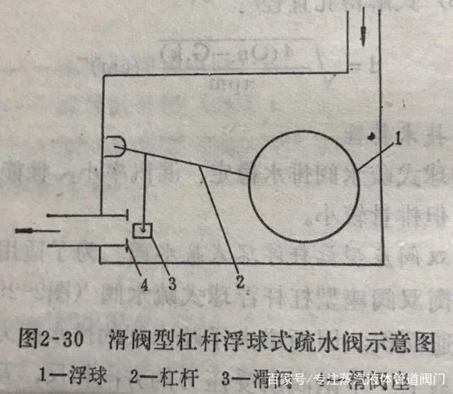 在截止阀型杠杆浮球式疏水阀的基础上,将关闭件的活动方式,由截止阀改为滑阀型(图2-30),这样开启阀门的作用力就可小于蒸汽压力对阀门的作用力,而只需大于阀门压紧的摩擦力即可,摩擦系数一般为0,3~0.4。此外,阀座上的排水孔可采取扁圆形,可以避免圆形排水孔容易产生旋涡而造成漏气现象,同时可以减小关闭件的行程。
