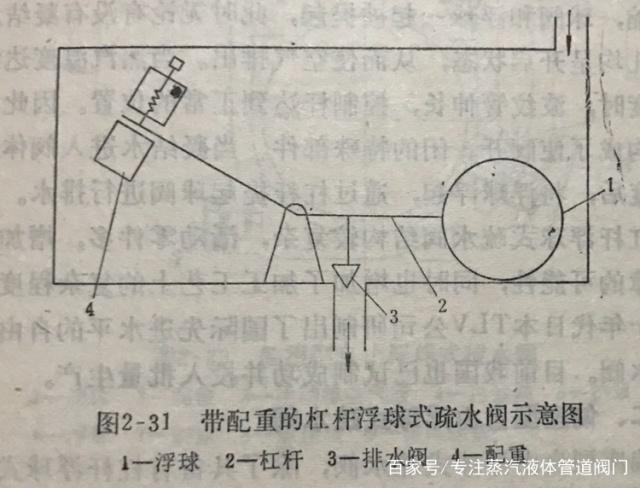 图2-28为截止阀型杠杆浮球式疏水阀的结构示意图。杠杆浮球式疏水阀排水稳定,漏气率小,性能可靠,排出饱和水,但排量较小。