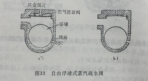 自由浮球式疏水阀也称为“自由浮子式”或“无杠杆浮球式”。因为是将球形浮子无约束地放置在疏水阀的阀体内部,所以设计时将浮球本身作为完成开关动作的阀瓣。如图33所示,球形浮子可自由开关而起到阀瓣的作用;利用它的上升或下降从而实现开、闭阀动作。在阀盖上部设置了空气排放阀。