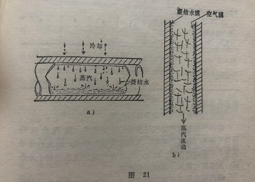 设备内蒸汽的潜热使被加热物加热,蒸汽则冷却,凝结成水,在管壁周围形成凝结水层(参看图21)。但是,若设备内部一旦退入空气,由于空气是不可凝气体(即不能液化),所以设备内管壁上的凝结水层内侧又形成空气层(参看图21b),且空气的热导率极小,比保温材料还小,因而,使蒸汽和被加热物之间的热交换能力显著降低。