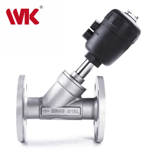 3、WK气动法兰角座阀先进的气动控制器:加厚工程塑料外壳,安全可靠。低磨损的活塞结构,容量大而低耗气量。内部元件自润滑,免维护