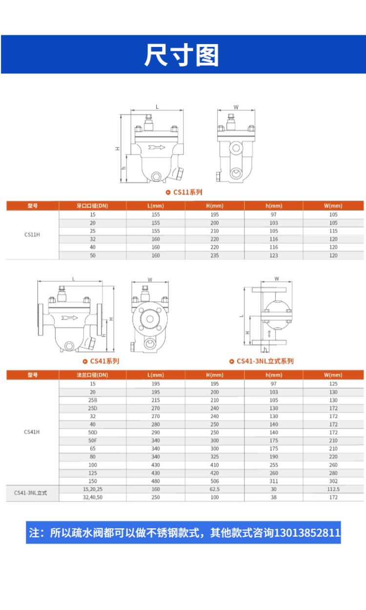 不锈钢疏水阀,可制作WCB/304/316的材质的阀门。自由浮球式不锈钢疏水阀能快速排水,阀体加厚设计寿命长。广泛使用在石油、化工、轻纺、印染、制药、造纸、食品,等工矿企业。咨询电话13013852811