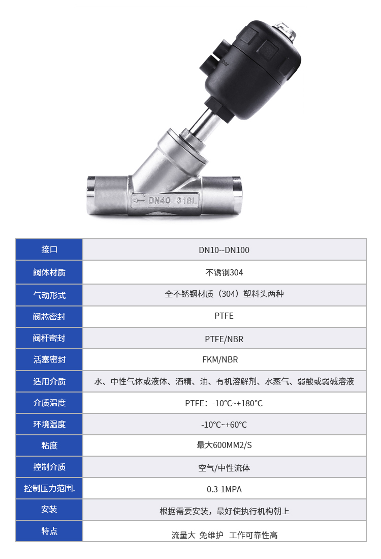 气动形式采用全不锈钢形式和塑料头、铝合金两种。使用介质广泛:水、中性气体或液体,酒精,油,有机溶解剂,水蒸汽,弱碱或者弱酸。